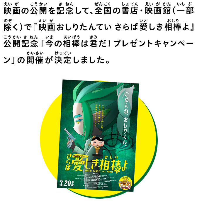「映画おしりたんてい さらば愛しき相棒(おしり)よ」公開記念 ほんやさん × えいがかん 今の相棒は君だ! プレゼントキャンペーン